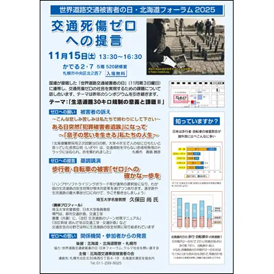 2025年11月15日(土)、札幌市の「かでる2・7」において「世界道路交通被害者の日・北海道フォーラム2025」(主催:北海道交通事故被害者の会)が開催されます。